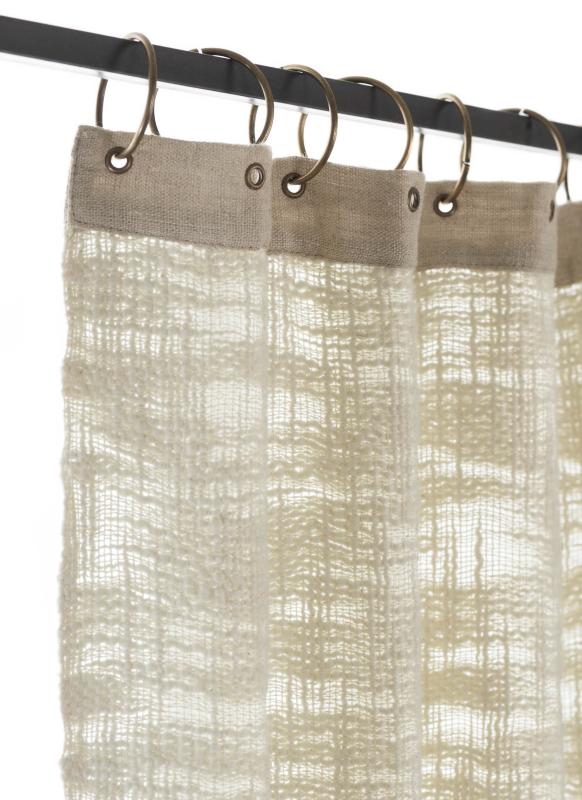 En tête une bande de lin parsemée d’œillets et des anneaux de 5 cm de diamètre pour l'accroche sur la tringle